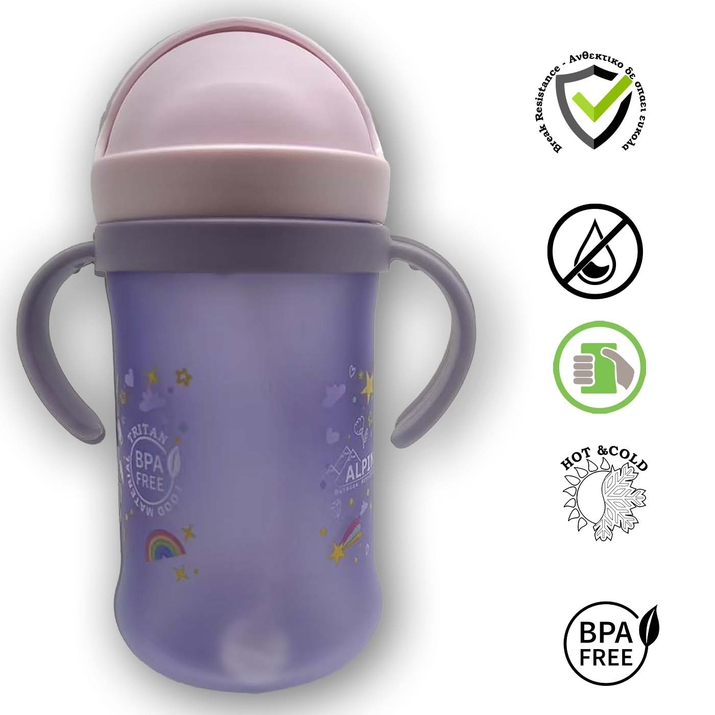 - Τα παγουρίνο της Alpin Kids ακολουθούν την ανάπτυξη του παιδιού σας. Καθώς έρχεται με χεράκια για την νεαρή ηλικία μπορούν να αφαιρεθούν για πιο εύκολη χρήση και αποθήκευση στη τσάντα αργότερα όταν μεγαλώσει