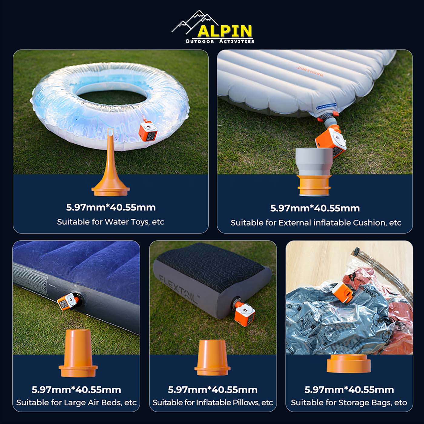 - ΠΕΝΤΕ ακροφύσια: Πέντε ακροφύσια είναι κατάλληλα για τα περισσότερα φουσκωτά προϊόντα, όπως στρώματα αέρα, πλωτήρες πισίνας, σακούλες αποθήκευσης κενού, φουσκωτά κρεβάτια, μαξιλάρια ύπνου, δαχτυλίδια κολύμβησης, φουσκωτά έπιπλα και άλλα φουσκωτά παιχνίδια